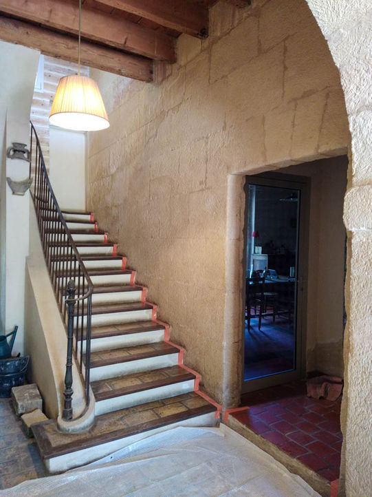 En complément, un enduit à la chaux à pierres vues a été réalisé sur toute la partie centrale de l'escalier desservant les trois étages.